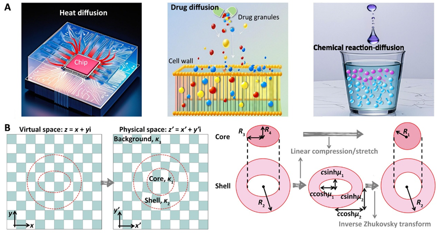 扩散现象是物质与能量输运的基本物理过程,广泛存在于热传导、质量迁移、化学反应、电子输运及生物流动等多种自然系统中。近年来,扩散超构材料(diffusion metamaterials)的发展为调控扩散流的空间行为提供了新路径。然而,现有设计方法通常依赖于强各向异性的材料构型,或需复杂的界面匹配策略,难以兼顾物理实现与工程可行性,尤其在面对瞬态过程与多物理场耦合系统时更显局限。此前,王骏与合作者发展了伪共形映射方法(pseudo-conformal mapping)以解决各向异性问题 (Chaos,Solitons and Fractals 174, 113849 (2023)),但其应用仍局限于稳态扩散场,且主要着力于流向重定向,对扩散强度等关键输运参量的调控能力有限。