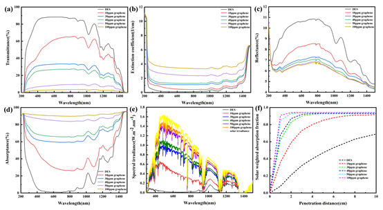 传统的纳米流体在DASCs中存在比热容大和容易颗粒聚集的缺点,这是造成光热效率低的重要原因。本文以高沸点、稳定性好、比热容小的尿素/氯化胆碱DES为纳米流体基液,其表现出了优异的光热性能。制备了不同质量浓度(0ppm、10ppm、30ppm、40ppm、50ppm、100ppm)的DES基石墨烯纳米流体,并对其性能进行了测试。主要研究结果如下:(i)纯DES的光热效率比水的光热转化率高36.4%。这是因为DES的比热容较小,在相同的热量下,它能达到更高的温度。此外,与水和EG相比,DES的平衡温度也最高,可达45.4℃。(ii)石墨烯的加入提高了DES的光热转换效率。40ppm石墨烯纳米流体的光热转换效率最高,为94.3%。特别是当太阳辐射为2000W•m-2时,40ppm石墨烯纳米流体的最高温度可达116°C。这为纳米流体在高温下的应用提供了一条可行的途径。(iii)DES基石墨烯纳米流体45天前后的透射光谱表明,DES基石墨烯纳米流体保持了良好的稳定性,几乎没有纳米颗粒的沉积和团聚。这些研究证明了DES基石墨烯纳米流体在DASCs上应用的潜力。