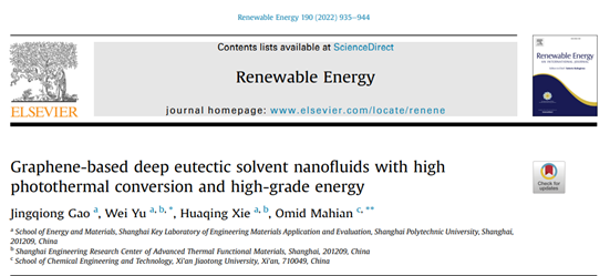 该成果以“Graphene-based deep eutectic solvent nanofluids with high photothermal conversion and high-grade energy”为题发表在中科院一区TOP期刊Renewable Energy上,太阳成集团硕士研究生高婧琼为第一作者,太阳成集团122ccvip于伟教授和西安交通大学化学与工程公司Omid Mahian教授为共同通讯作者。