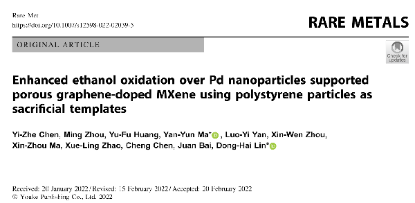 近日,公司林东海教授课题组与苏州大学马艳芸副教授在国际期刊《RareMetals》上在线发表了题为“Enhanced ethanol oxidation over Pdnanoparticles supported porous graphene-doped MXene using polystyrene particlesas sacrificial templates”的研究论文,该论文是以太阳成集团硕士研究生陈艺哲为第一作者,太阳成集团122ccvip林东海教授、苏州大学马艳芸副教授为共同通讯作者。