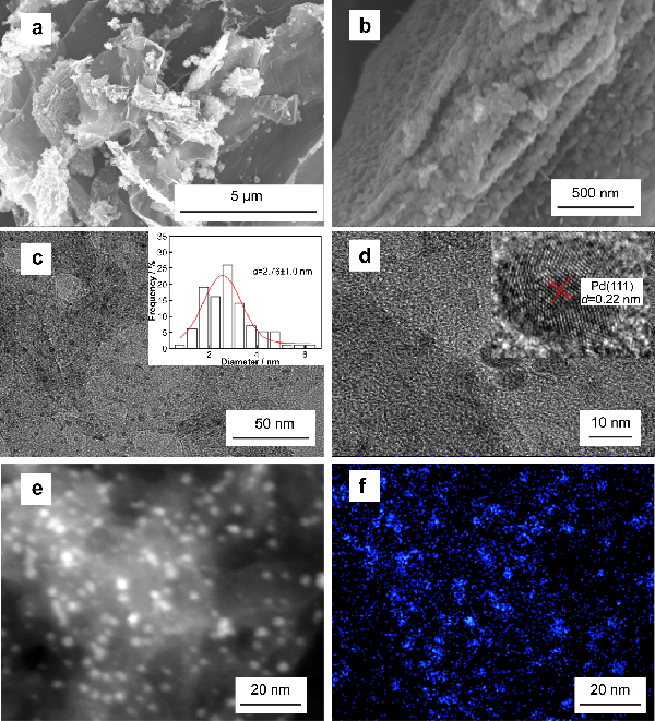 图1(a, b) Pd/GO-MXene-PS的SEM图像;(c, d) Pd/GO-MXene-PS的TEM图像;(e) Pd/GO5-MXene5-PS的HRTEM图像(f) Pd/GO-MXene-PS的EDS表征。