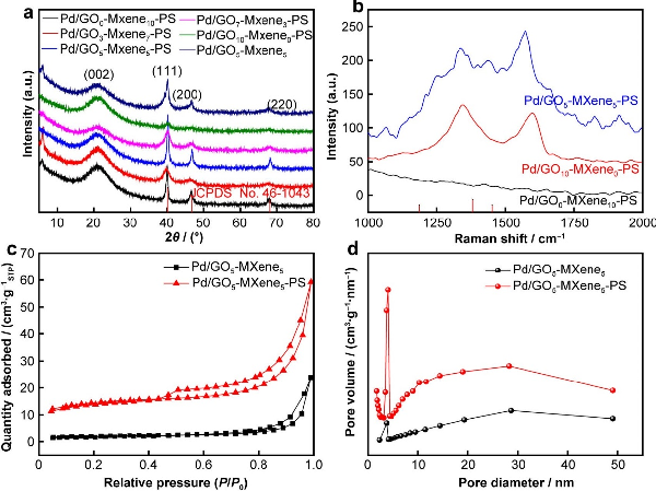 图2.(a)Pd/GO10-MXene0-PS、Pd/GO7-MXene3-PS、Pd/GO5-MXene5-PS、Pd/GO3-MXene7-PS、Pd/GO0-MXene10-PS和Pd/GO5-MXene5的XRD图;(b)Pd/GO10-MXene0-PS、Pd/GO5-MXene5-PS和Pd/GO0-MXene10-PS的拉曼光谱;Pd/GO5-MXene5-PS和Pd/GO5-MXene5;(c)氮气吸附曲线(d)孔径分布
