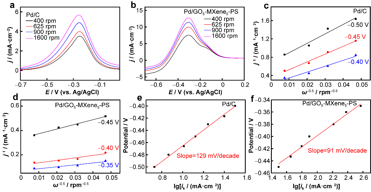 图5(a)商业Pd/C电极和(b)Pd/GO5-MXene5-PS以20 mV/s的扫描速率,在1 M C2H5OH和1 M KOH中进行的不同旋转速率的RDE测试;(c)商业Pd/C电极和(d)Pd/GO5-MXene5-PS催化剂的Koutecky-Levich方程拟合曲线。(e)商业Pd/C电极和(f)Pd/GO5-MXene5-PS催化剂的塔菲尔斜率拟合曲线