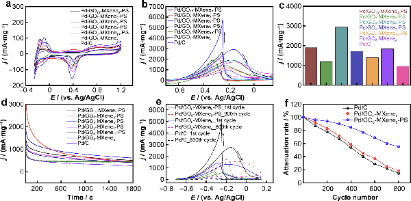 图4 商业Pd/C和6种催化剂在(a)0.5 M H2SO4;(b)1 M KOH+1 M C2H5OH中的CV图;(c)正向电流密度的柱状图;(d)i-t曲线。商业Pd/C、Pd/GO5-MXene5-PS和Pd/GO5-MXene5催化剂在1M KOH+1 MC2H5OH(e)800次电位循环前后的CV图;(f)正向电流密度随扫描圈数变化情况。