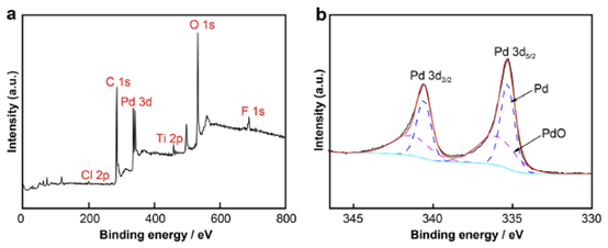 图3 Pd/GO5-MXene5-PS的XPS谱图(a)全谱,(b)Pd 3d的高分辨率谱图