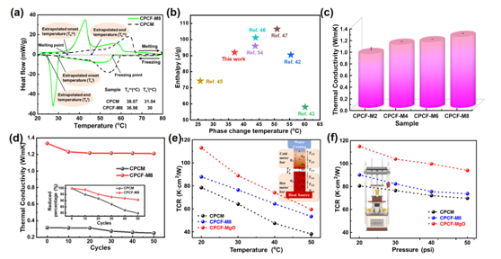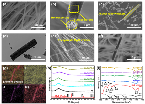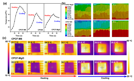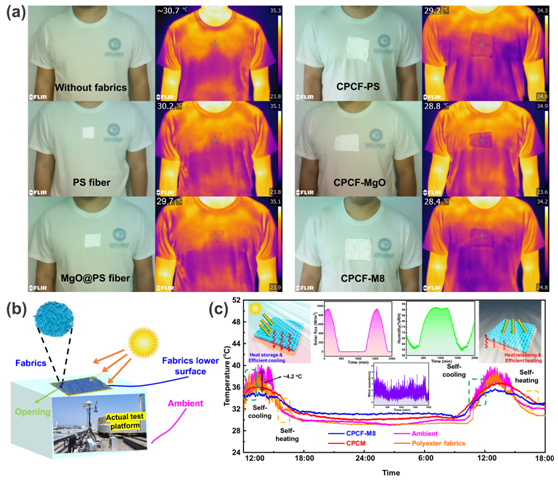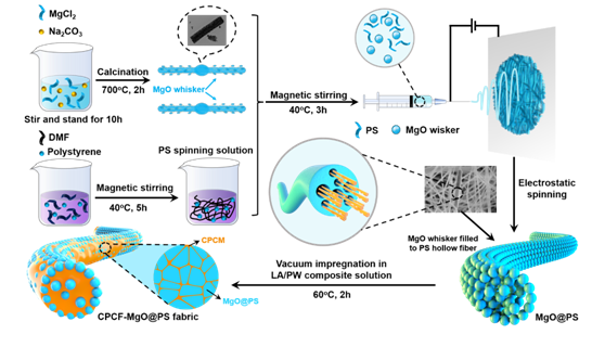 本文利用石蜡和月桂酸两种相变材料的优点,制备了复合相变材料。氧化镁(MgO)晶须作为热填料被封装在聚苯乙烯(PS)中空纤维中,形成纳米结构MgO@PS纤维。通过优化实验条件,使晶须尺寸与中空纤维相匹配。MgO晶须的引入确保了固有热导率的提高。同时,由于涂覆的PSCPCM基体具有良好的相容性,CPCM溶液可以通过自扩散策略浸没到纳米结构的MgO@PS纤维中,从而实现更有效的界面传热。由于特殊设计的纳米结构和采用的制备策略,所制备的织物在人体和外部环境的热管理方面都具有有效的温度调节作用。