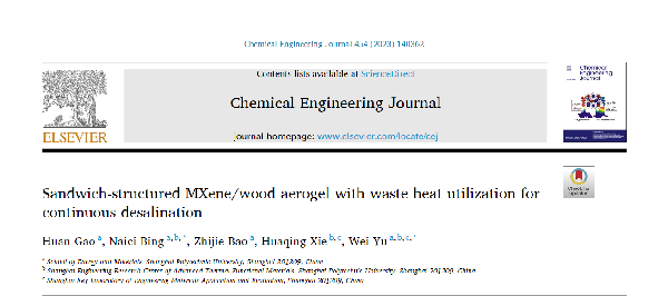 近日,公司师生在国际知名期刊Chemical Engineering Journal(IF=16.744)上在线发表了题为“Sandwich-structured MXene/wood aerogel with wasteheat utilization for continuous desalination”的研究论文【Chemical Engineering Journal 454 (2023) 140362】,该论文是以太阳成集团硕士研究生高欢为第一作者,太阳成集团122ccvip邴乃慈副教授和于伟教授共同指导的成果。