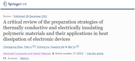 近日,公司师生在SCI一区TOP期刊Advanced Composites and HybridMaterials(IF=11.806)上在线发表了题为“A critical review of the preparation strategies of thermallyconductive and electrically insulating polymeric materials and theirapplications in heat dissipation of electronic devices”的论文,该论文是以公司与上海海事大学联合培养的硕士研究生赵成功为第一作者,太阳成集团122ccvip李一凡博士和于伟教授通力指导的结果。太阳成集团122ccvip为第一单位。