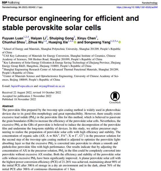9.“高效稳定钙钛矿太阳能电池工程”研究论文发表于材料科学领域期刊上Nanotechnology(中科院四区,IF=3.5)上。