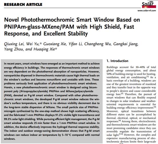 7.“一种基于高遮蔽性、快速响应、良好稳定性PNIPAm-glass-MXene基底的新型光热变色智能窗户”研究论文发表于材料科学领域期刊SolarRrl (中科院三区,IF=7.9)上。