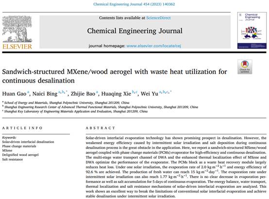 6.“采用MXene/木材气凝胶与相变材料夹层结构实现高效连续脱盐”研究论文发表于工程科学领域期刊ChemicalEngineering Journal (中科院一区TOP,IF=15.1)上。