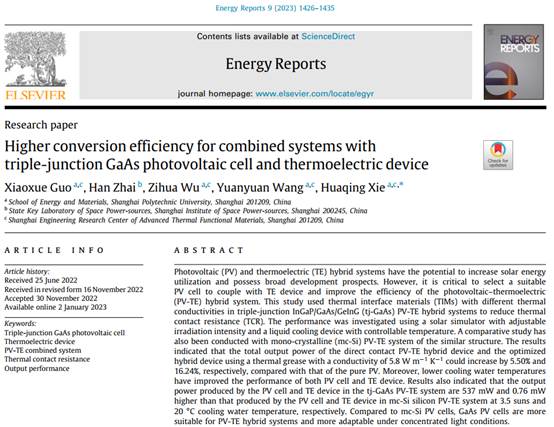 11.“高转化率三结GaAs光伏电池和热电设备组合系统”研究论文发表于工程科学领域期刊EnergyReports (中科院三区,IF=5.2)上。