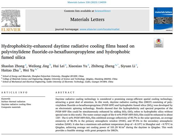 10.“基于聚偏氟乙烯-共六氟丙烯和疏水气相二氧化硅的疏水性强化日间辐射冷却膜”研究论文发表于材料科学领域期刊MaterialsLetters (中科院四区,IF=3)上。