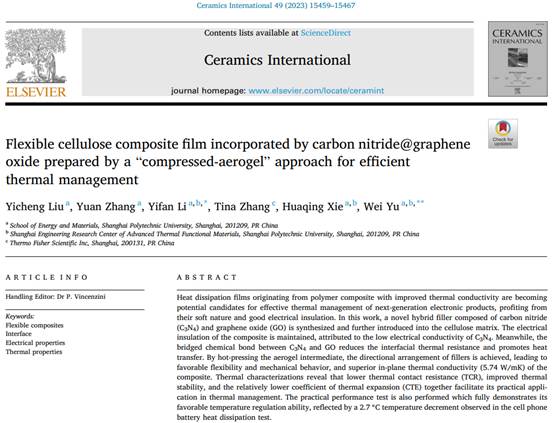 5.“利用压缩气凝胶制备氮化碳@氧化石墨烯/纤维素薄膜用于高效热管理”研究论文发表于材料科学领域期刊CeramicsInternational (中科院二区TOP,IF=5.2)上。