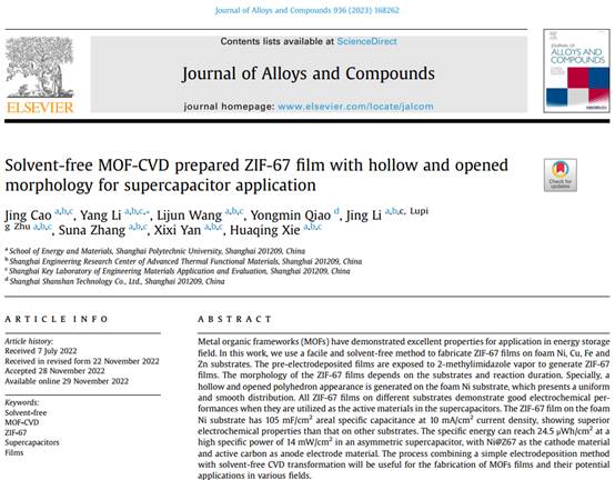 2. “无溶剂MOF-CVD法制备用于超级电容器的具有中空开放形貌ZIF-67薄膜”研究论文发表于材料科学领域期刊Journalof Alloys and Compounds (中科院二区TOP,IF=6.2)上。