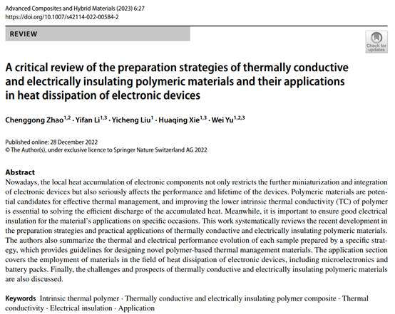 1. “导热和电绝缘聚合物材料的制备及其在电子器件散热中的应用”研究论文发表于材料科学领域期刊AdvancedComposite and Hybrid Materials (中科院二区,IF=20.1)上。
