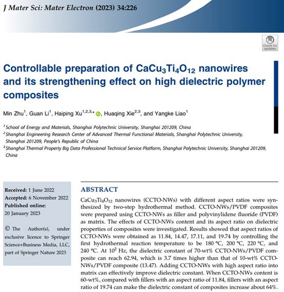 8.“可控制备CaCu3Ti4O12纳米线及其对高介电聚合物复合材料的强化作用”研究论文发表于材料科学领域期刊Journalof Materials Science-Materials in Electronics (中科院四区,IF=2.8)上。