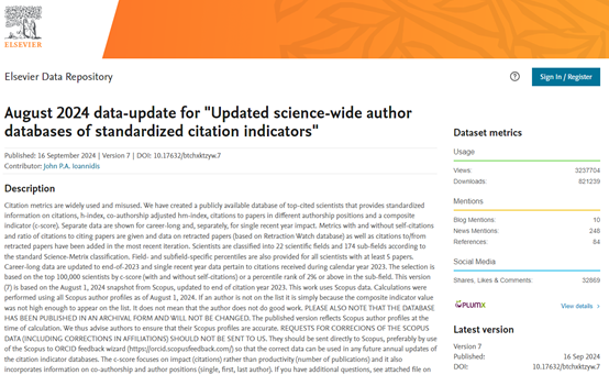 2024年9月16日,美国斯坦福大学发布了全球前2%顶尖科学家2024榜单(Worlds’Top 2% Scientists 2024)。该榜单由斯坦福大学John P. A. Ioannidis教授团队与Elsevier旗下MendeleyData发布,基于Scopus数据库,使用了如下六种关键因素的指标来进行打分:(1)总引用量;(2)HirschH-index;(3)共同作者修正的SchreiberHm-index;(4)单独作者;(5)单独或者第一作者;(6)单独、第一或者最后作者的文章引用量。此数据提供了一个面向科学家长期科研表现的衡量指标,能够更客观、更真实的反映科学家的影响力。