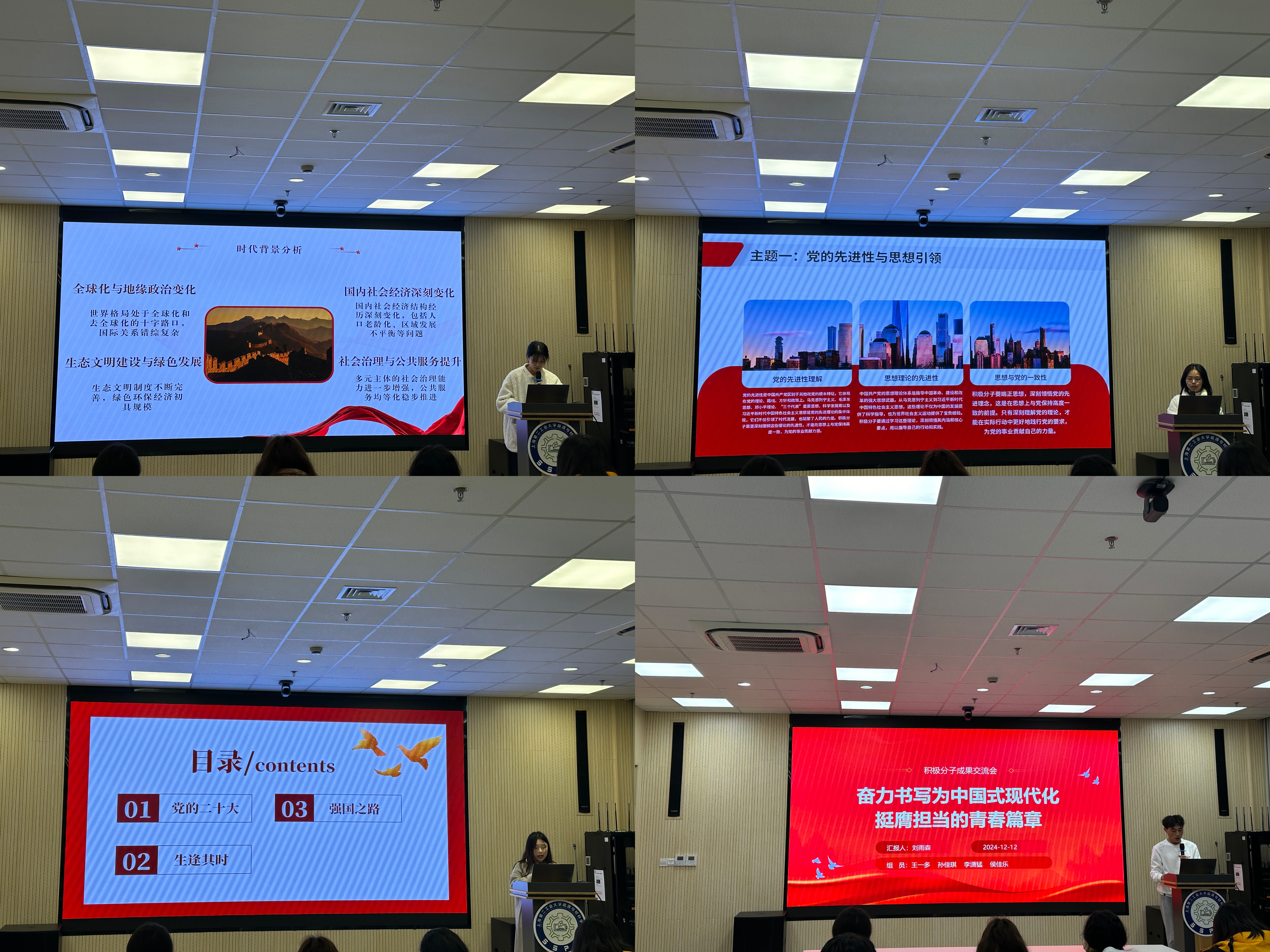 会上,入党积极分子分为七个小组,各小组成员依次以PPT形式围绕“我对党的认识”“作为入党积极分子如何端正入党动机”“怎样理解‘组织上入党一生一次,思想上入党一生一世’”“青年老员工的使命担当”等主题进行陈述,有的积极分子深入剖析了党的二十大精神内涵,阐述在科技创新与绿色发展理念引领下,如何将个人的学业追求与国家能源材料战略需求相结合;有的则分享了在参与志愿服务活动中,对党的根本宗旨—全心全意为人民服务的深刻体会,讲述身边党员榜样如何用实际行动践行初心使命,激励自己在今后也要时刻以党员标准严格要求,积极奉献社会。在自由交流环节,积极分子们就学习过程中遇到的困惑与思考展开了讨论。