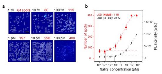 本项研究利用自主开发的基于高压AFM探针的改进纳米静电印刷技术,成功将荧光染料与具有特定H2S反应性的猝灭剂(F12+分子)共组装成分子纳米阵列,开发出一种能够检测飞摩尔级别H2S的分子纳米阵列传感器。该检测平台实现1 fM的检测限和较宽的范围检测,具有良好的特异性和可靠度。这一成果不仅在H2S检测领域具有重要意义,还可扩展到其他分子荧光探针系统,对推动生物小分子的超灵敏信号检测具有重要意义。