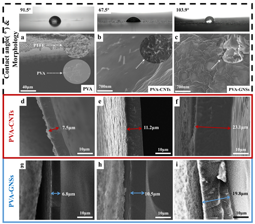 图 3.(a-c)PVA、PVA-CNTs和PVA-GNSs膜的SEM表面形态图像和接触角;(d�Cf)PVA-CNTs 膜的 SEM 横截面图像厚度 - 10、25、50 m;(g-i)PVA-GNSs 膜厚度 10、25、50 μm的 SEM 横截面图像
