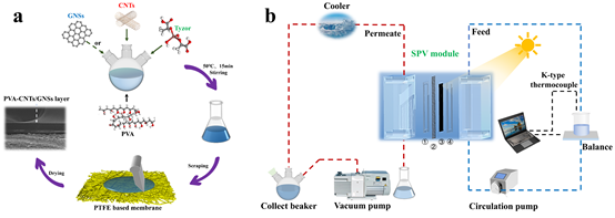 图2 (a). 光热复合膜制备流程. (b). 太阳能渗透汽化系统示意图