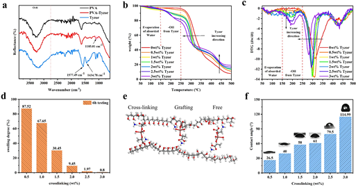 图4.(a) PVA、PVA-Tyzor、Tyzor的FTIR光谱图像,(b) PVA-Tyzor的TGA,(c) PVA-Tyzor的DTG,(d) PVA溶解度,(e) PVA分子链的交联,(f) PVA膜的接触角。