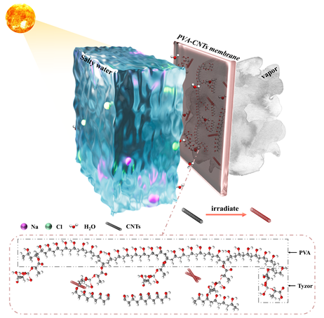 渗透汽化(PV)技术将热处理与膜分离相结合,由于其单极分离速率高、能耗高,已成为一种很有前途的海水淡化工艺。然而,传统的渗透汽化系统需要对溶液进行加热,以建立跨膜的蒸气压差异,从而导致显著的能源消耗。相比之下,太阳能是一种清洁丰富的资源,使其与渗透汽化相结合是一种以较低的能源成本实现海水淡化的有效方法。本研究以碳纳米管(CNTs)和石墨烯纳米片(GNSs)为光热转换材料。开发了基于聚乙烯醇(PVA)与CNT 或 GNSs (PVA-CNT/PVA-GNSs)混合的光热复合膜,随后将其整合到新型太阳能渗透汽化(SPV)系统中。在该 SPV 系统中,溶液被太阳辐射加热,太阳辐射被膜上的 CNTs/GNSs 吸收,显著降低了与系统相关的能源成本。实验结果表明,在一个太阳光下,系统通量可达 3.02 kg m-2h-1,新型SPV 系统优于许多以往报道的太阳能海水淡化系统。本研究建立了一种低能耗 SPV 海水淡化方法,为利用渗透汽化技术开发实际海水淡化应用提供了一条有前途的途径。