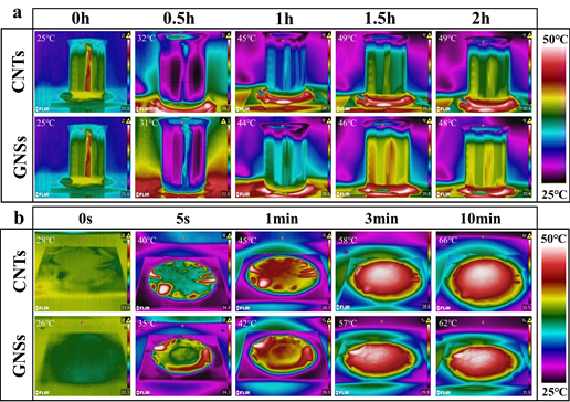 图 5.(a)蒸发实验过程中 CNT 和 GNSs 复合膜的真实图片;(b)模拟阳光强度下 CNT 和 GNSs 复合膜的成像图。