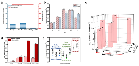 图 6.太阳能渗透蒸发性能:(a)产物水电导率和脱盐率,(b)不同浓度的 PVA-CNTs 和 PVA-GNSs 膜,(c)不同浓度和层厚的 CNTs 膜,(d)不同光照条件下 PVA、PVA-CNTs和 PVA-GNSs 膜的膜密度,(e) SPV 系统与文献报道的海水淡化技术的用水生产率比较。
