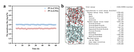 图 7.(A) PVA-CNTs和PVA-GNSs膜的通量变化,(b) PTFE-PVA膜间结合能的能量分布