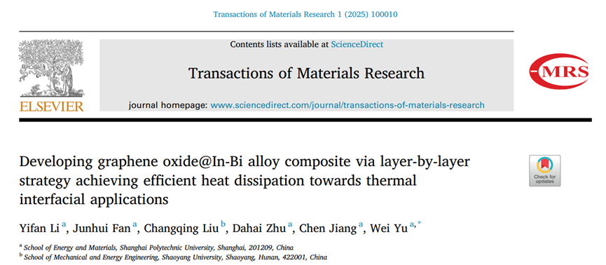 公司李一凡副教授作为首刊作者代表,获“中国材料研究学会特邀论文”证书。于伟教授、李一凡副教授团队长期围绕导热界面材料展开科研攻关并取得了一系列丰硕的成果,本次发表在Transactions of Materials Research期刊上的工作文章题目为Developing graphene oxide@In-Bi alloy composite via layer-by-layer strategy achieving efficient heat dissipation towards thermal interfacial applications。