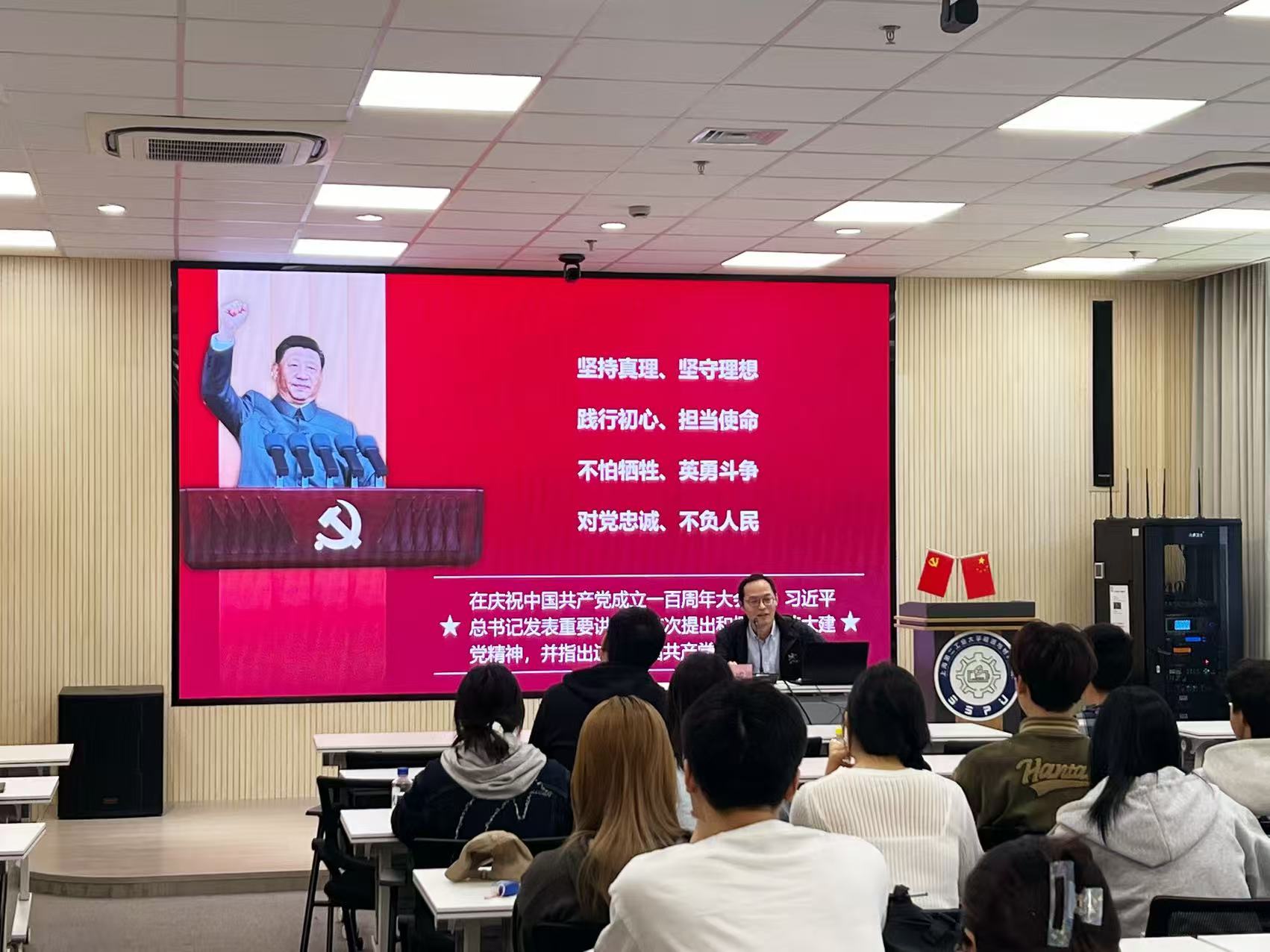 4月25日,首场党课邀请了马克思主义公司金二威博士主讲《弘扬伟大建党精神,做新时代先锋力量》。党课以《百年号角》红色歌曲导入,从历史背景、理论渊源、实践基础、文化土壤四大维度解析建党精神,结合革命先烈事迹,阐释坚持真理、坚守理想的精神内核。金老师强调,伟大建党精神是新时代青年的精神灯塔,当以历史映照现实的自觉勇担复兴重任。