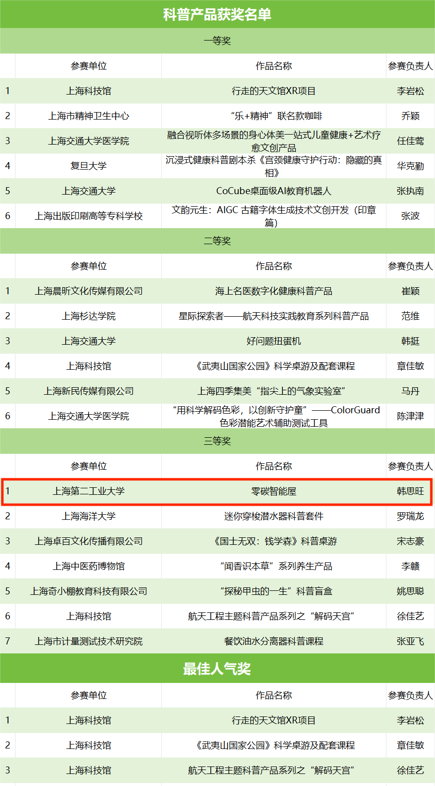 上海首届科普大赛以“科技创新引领未来,科普赋能全民参与”为宗旨,分设科普视频和科普产品两个赛事单元,围绕未来能源、人工智能、生物医药等领域发掘优秀科普力量。大赛吸引了来自全市高校、科研院所、科普基地等多家单位报名参赛,最终科普产品单元比赛决出一等奖6名、二等奖6名、三等奖7名,以及“最佳人气奖”3名。