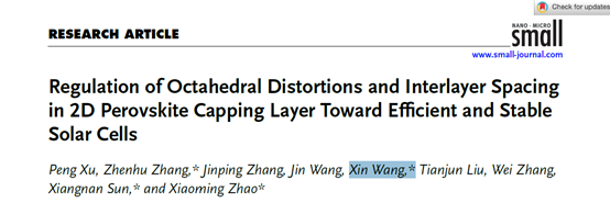 近日,公司青年教师王鑫在国际知名期刊Small(JCR一区,中科院二区Top,IF=12.1)合作撰写并发表了题为《Regulationof Octahedral Distortions and Interlayer Spacing in 2D Perovskite Capping LayerToward Efficient and Stable Solar Cells》的研究论文,公司王鑫博士与南京航空航天大学孙向楠、赵晓明教授等为共同通讯作者。