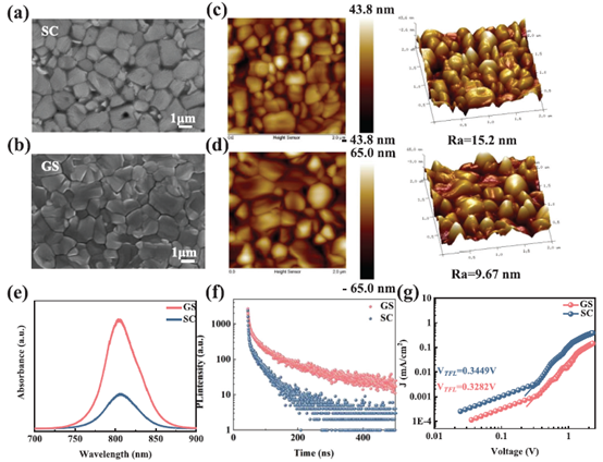 4. a-b)钙钛矿薄膜在(a) SC 和(b) GS 工艺下的 SEM 图;c-d) 钙钛矿薄膜在(c) SC 和(d) GS 工艺下的二维(左)及对应三维(右)表面形貌 AFM 图;e) SC 和 GS 方法所制备钙钛矿薄膜的 PL 光谱;f) SC 和 GS 方法所制备钙钛矿薄膜的 TRPL 光谱;g) 采用 SC 和 GS 工艺制备的单电子器件的 SCLC曲线。