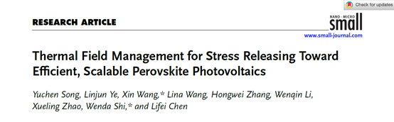 近日,公司师生在国际知名期刊Small(JCR一区,中科院二区Top,IF=12.1)上发表了题为“ThermalField Management for Stress Releasing Toward Efficient, Scalable PerovskitePhotovoltaics”的研究论文,公司硕士研究生宋昱辰、叶林俊为论文共同第一作者,王鑫博士为论文第一通讯作者。