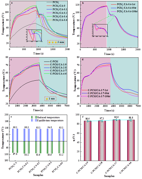 本研究以壳聚糖基碳气凝胶为支撑材料,将共晶MgCl26H2O和NH4Al(SO4)212H2O为相变材料,构建了一种有效太阳能储能的共晶C-PCM/CA,储能密度可达214.8 J/g,比纯MgCl26H2O提高30.8%。此外,基于碳纳米材料和ZrC材料的协同光能吸收作用,共晶相变材料可以有效地捕获太阳能,表现出良好的光热转换效率(89.5%)。构建共晶后,腐蚀分子减少流动扩散,有效缓解了腐蚀效应,同时冷却过程中水合盐的过冷问题得到解决。经多次试验,所制备的共晶C-PCM/CA表现出良好的热循环稳定性,为集成实用的太阳能储能和缓蚀效应提供了一种有前景的策略。