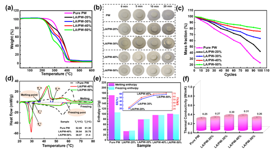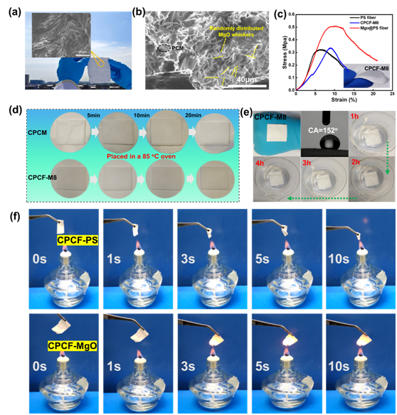 本文利用石蜡和月桂酸两种相变材料的优点,制备了复合相变材料。氧化镁(MgO)晶须作为热填料被封装在聚苯乙烯(PS)中空纤维中,形成纳米结构MgO@PS纤维。通过优化实验条件,使晶须尺寸与中空纤维相匹配。MgO晶须的引入确保了固有热导率的提高。同时,由于涂覆的PS与CPCM基体具有良好的相容性,CPCM溶液可以通过自扩散策略浸没到纳米结构的MgO@PS纤维中,从而实现更有效的界面传热。由于特殊设计的纳米结构和采用的制备策略,所制备的织物在人体和外部环境的热管理方面都具有有效的温度调节作用。