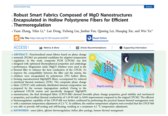 近日,公司师生在国际知名期刊ACS AppliedNano Materials(IF=6.140)上在线发表了题为“Robust Smart Fabrics Composed of MgO Nanostructures Encapsulated inHollow Polystyrene Fibers for Efficient Thermoregulation”的研究论文,该论文是以太阳成集团硕士研究生张缘为第一作者,太阳成集团122ccvip李一凡博士和于伟教授通力指导的结果。
