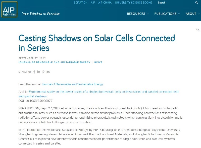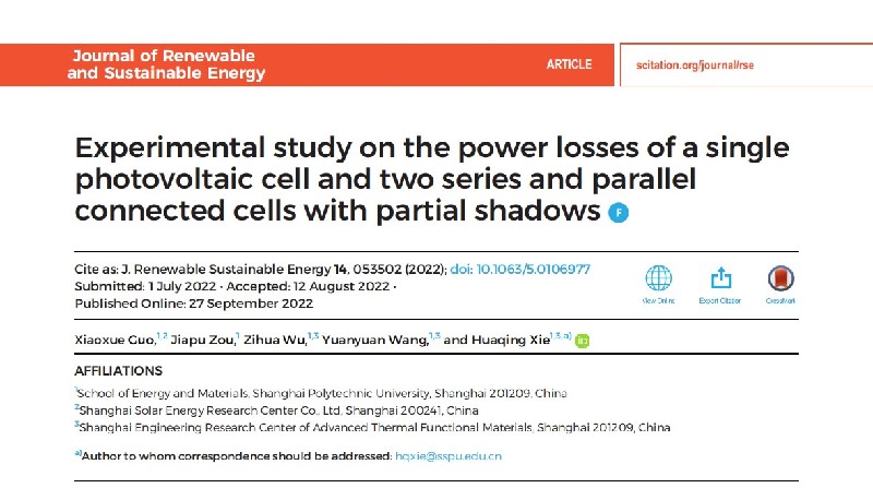 Recently, SSPU postgraduates Guo Xiaoxue and Zou Jiapu jointly published an academic paper “Experimental Study on the Power Losses of a Single Photovoltaic Cell and Two Series and Parallel Connected Cells with Partial Shadows” on Journal of Renewable and Sustainable Energy (AIP Publishing), a globally well-known journal in the field of renewable energy. Due to its high value in relevant research field, the paper was praised by peer researchers and editors and was elected as “Editor's Pick”. Editor's Picks serve to highlight articles with excellent scientific quality and are representative of the work taking place in a specific field.