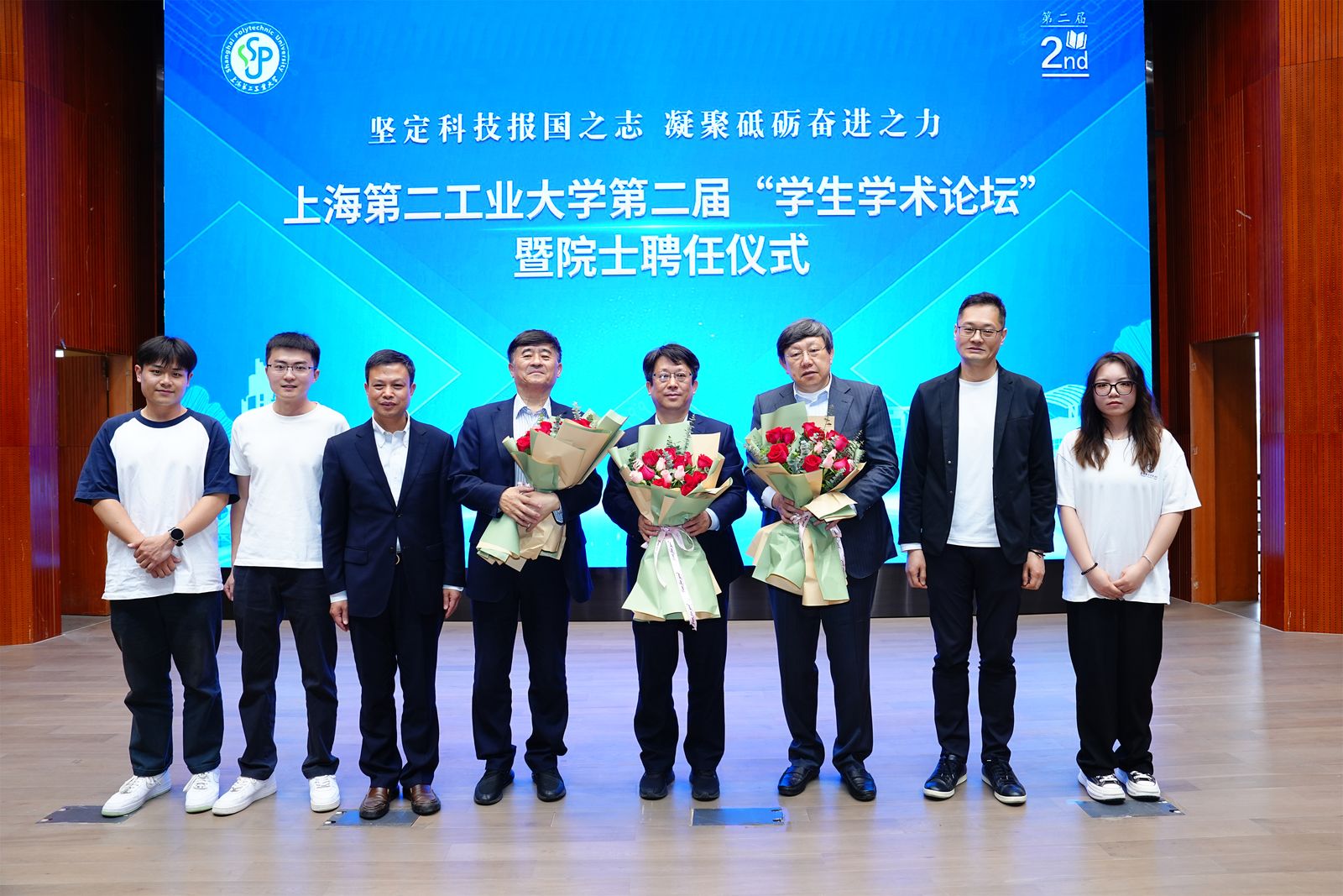 On April 26, the second Student Academic Forum andAcademician Appointment Ceremony was held in the 400-person lecture hall ofGraphic Information Center. Academician Yang Weimin, academician of the ChineseAcademy of Engineering, organic chemical expert, Dean of Sinopec ShanghaiResearch Institute of Petrochemical Technology, Director of the State KeyLaboratory of Green Chemistry and Industrial Catalysis; academician Qian Wei,academician of the American Academy of Medical and Biological Engineering,lifelong professor of the University of Texas, honorary dean of NortheasternUniversity of China; academician of the Japanese Academy of Engineering,automation expert, internationally renowned expert in the study of intelligentbionic robots, life-long professor of the National University of Agricultureand Technology of Japan. Academician Deng Mingcong, a lifelong professor ofA&M University, President Xie Huaqing, Vice President Ding Li, heads ofrelevant functional departments, Heads of Colleges, Deputy Secretaries in chargeof student work, and representatives of faculty and students and more than 400people attended the forum.