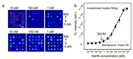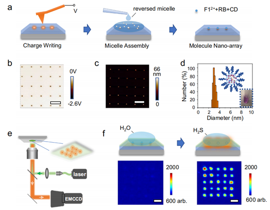 In this study, a self-developed improved nano-electrostaticprinting technology based on high-pressure AFM probes was used to co-assemblefluorescent dyes and quenchers (F12 + molecules) with specific H2S reactivityinto molecular nano-arrays. A molecular nano-array sensor capable of detectingH2S in the order of femtomolar has been developed. The detection limit of 1 fMand a wide range of detection can be achieved with this platform, which hasgood specificity and reliability. This achievement is of great significance notonly in the field of H2S detection, but also in other molecular fluorescentprobe systems, which is of great significance in promoting the ultra-sensitivesignal detection of biological small molecules.