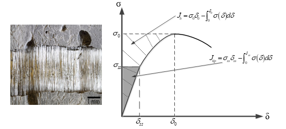 超疏水高延性混凝土具有优越机械性能,如高强度、高韧性和优异的变形能力,特别是其能够承受大量拉伸和弯曲而不断裂的能力,特别是其粘结强度,高延性纤维混凝土与砌体结构粘结强度高,单面加固的效果优于传统的双面钢筋网水泥砂浆加固方法。这对于外墙体部位尤为重要,因为它可以保持建筑的原始外观不被破坏。遵循强度准则即基体初裂强度小于纤维桥接应力,能量准则即最大余能大于裂缝尖端韧性。主要展现在图1和图2.